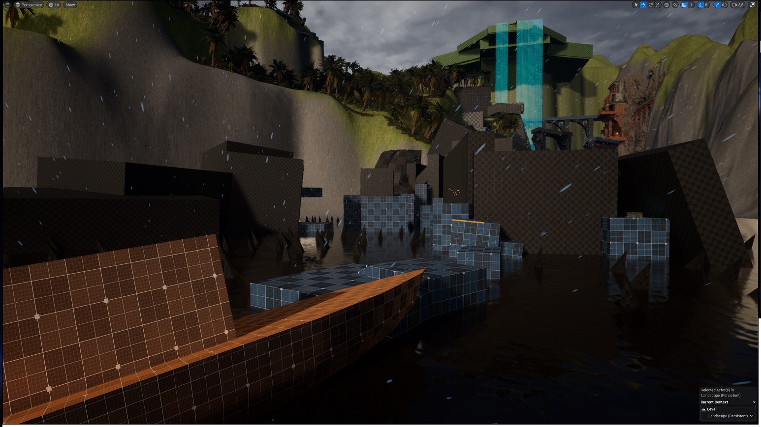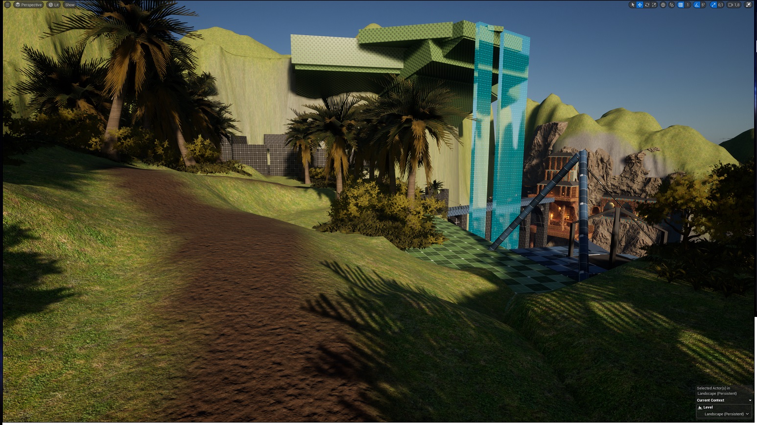 Which leads me to the level itself. We recieved a basic premise and a bubble diagram and were told to pretty much go all out. Well I did went all in on this one. The terrain visible here isn't that different from what I got at the start. My whole reasoning for quite an extreme terrain was "who said islands can't have mountains?" and rolled with it. Yes I had to move things a bit in relation to the diagram, but it was fine the end.